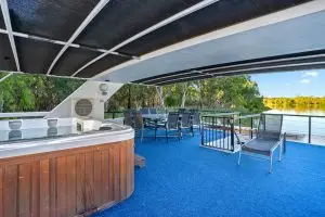 Upstairs, the shaded upper deck invites you to relax in the gas-heated spa or lounge in the sun. The rear deck features a Gourmet Weber Q, swim deck with ladder, and ample space for alfresco dining.