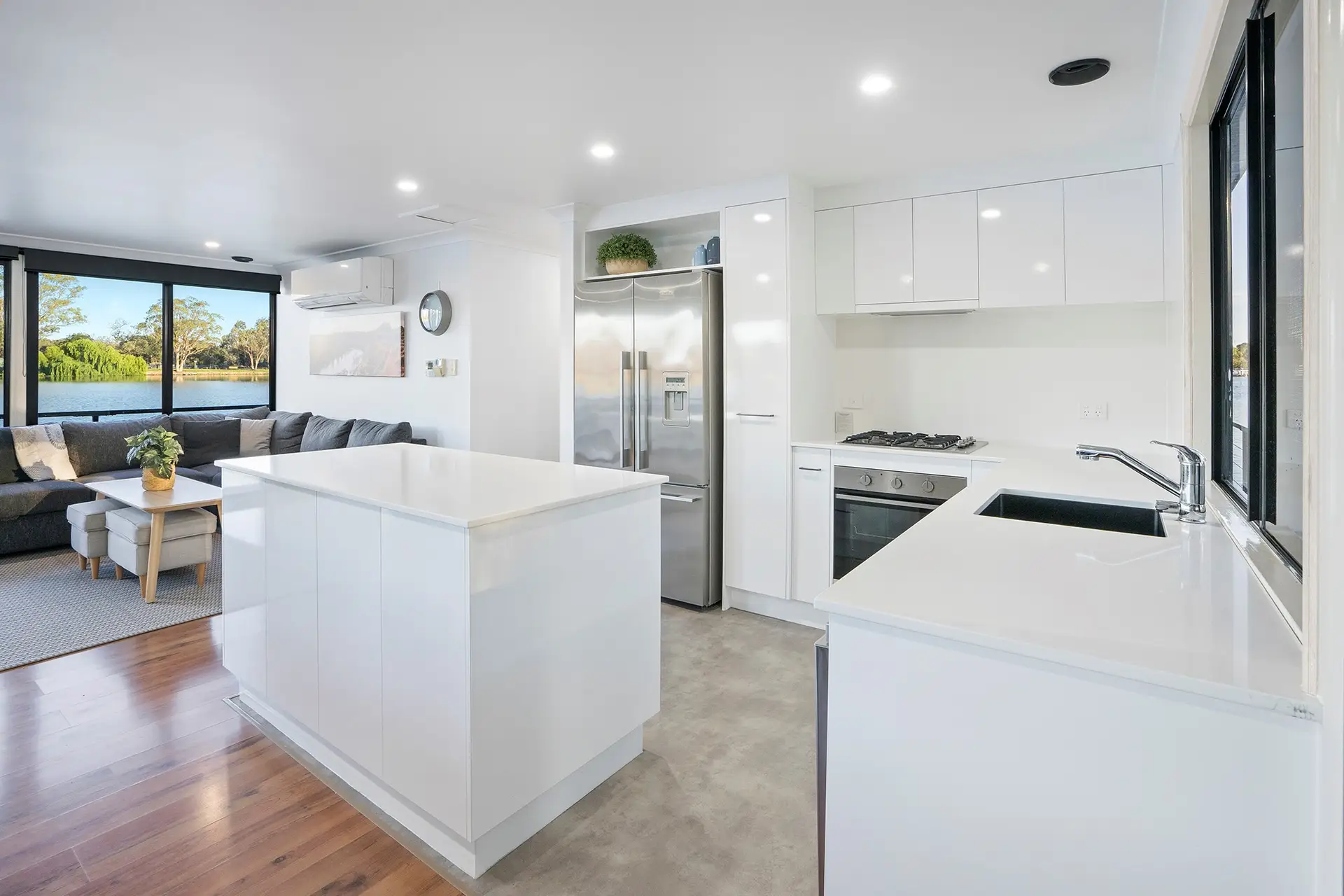 Step aboard and experience the perfect blend of luxury, comfort, and natural tranquillity. The beautifully designed kitchen is a culinary haven, complete with stone benchtops, a French door fridge with an ice and water dispenser, and a DeLonghi Nespresso Coffee Pod Machine for that perfect morning coffee. The open-plan lounge and dining area, with a sleek modern setting for up to 12 guests, offers a welcoming space to relax, dine, and take in panoramic views of the Murray River.